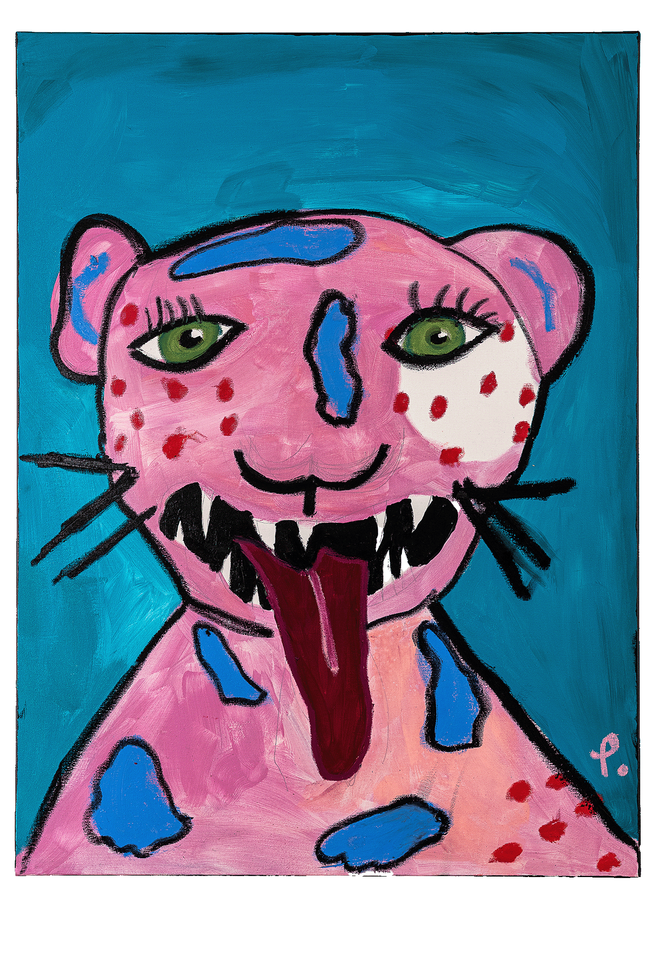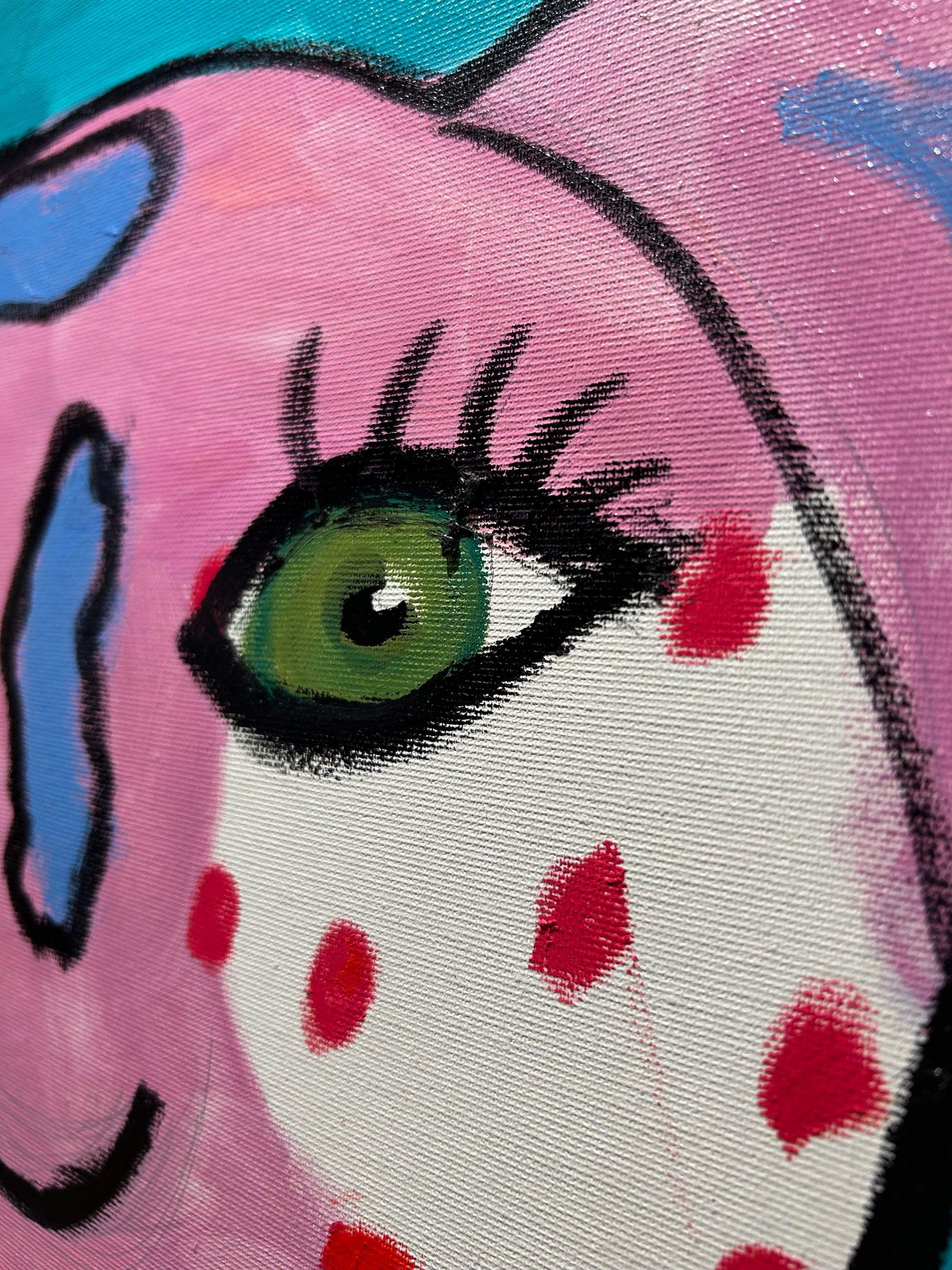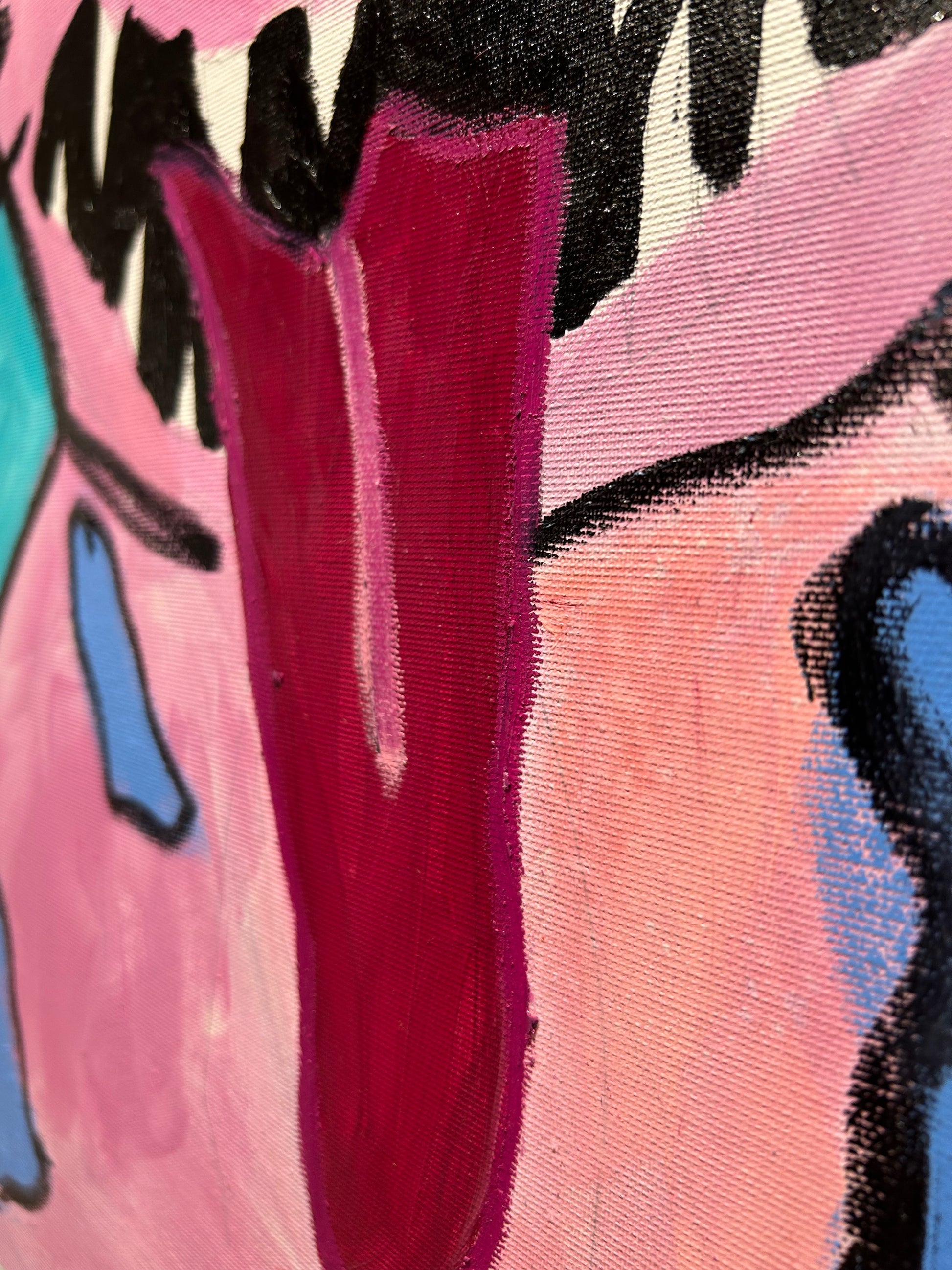 This painting is a critique of our world obsessed with surveillance and self-image. The single eye symbolizes the constant gaze of society, always judging. The bright pink background and colorful patterns represent the chaos of our daily lives, where everything is filtered and retouched.